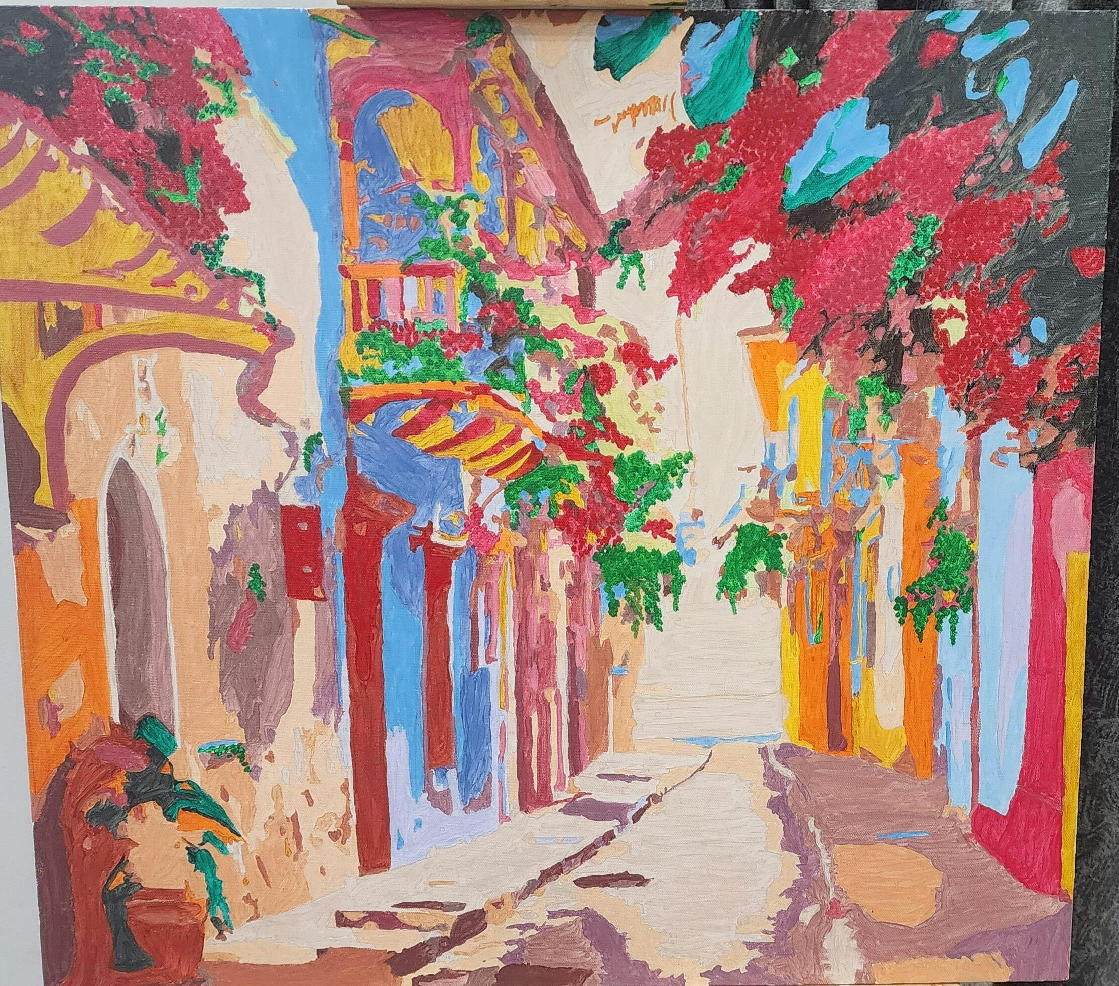 Paint By Number Kit is a type of D.I.Y (Do It Yourself) which offers an enjoyable and straightforward method for crafting artwork. Colourful Streets artwork is divided into numbered sections on canvas (pre-marked canvas), and by matching the provided paints to these numbers, you gradually complete the painting with precision and ease.
