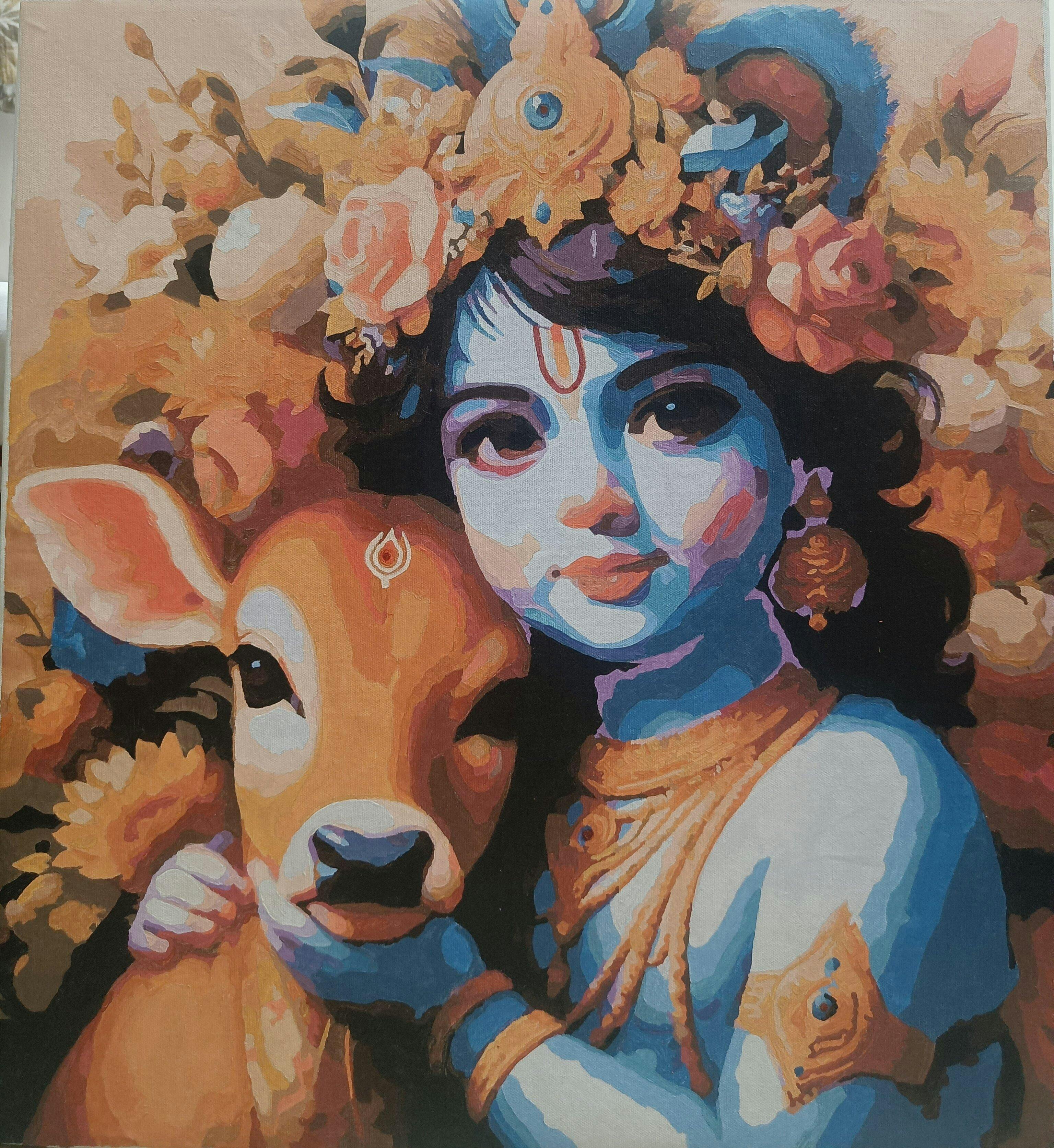 Paint By Number Kit is a type of D.I.Y (Do It Yourself) which offers an enjoyable and straightforward method for crafting artwork. Govinda Balak : Krishna artwork is divided into numbered sections on canvas (pre-marked canvas), and by matching the provided paints to these numbers, you gradually complete the painting with precision and ease.